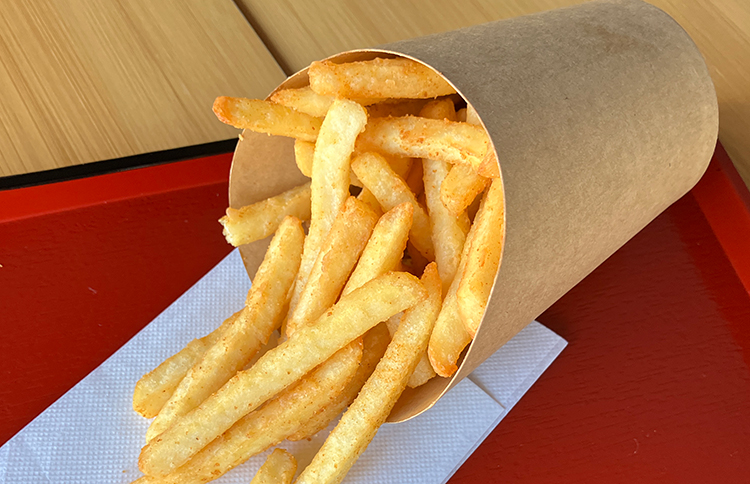 衣がついたカリカリのポテトフライに当店オリジナルのケイジャンスパイスパウダーをかけて味付けしたアメリカでよく食べられているスタイルのポテトフライです。冷めても最後までおいしくお召し上がりいただけます。