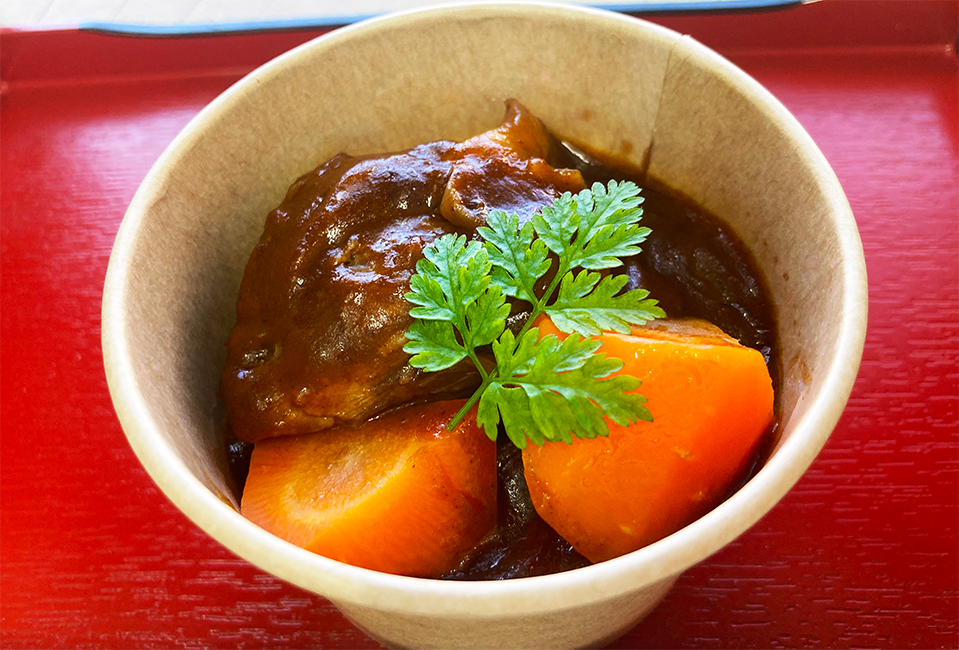 三元豚肩ロースを濃厚デミグラスソースで32時間かけてじっくりと煮込みました。旨みたっぷりのシチューと、とろけるお肉が絶品です。